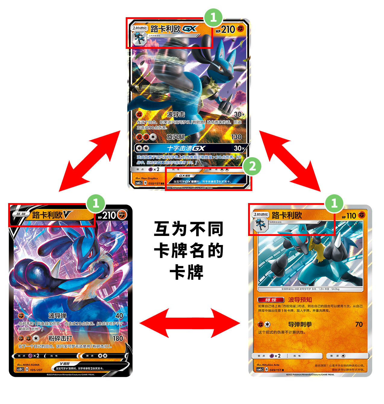 - “路卡利欧”和“路卡利欧GX”以及“路卡利欧V”互为不同卡牌名的宝可梦。